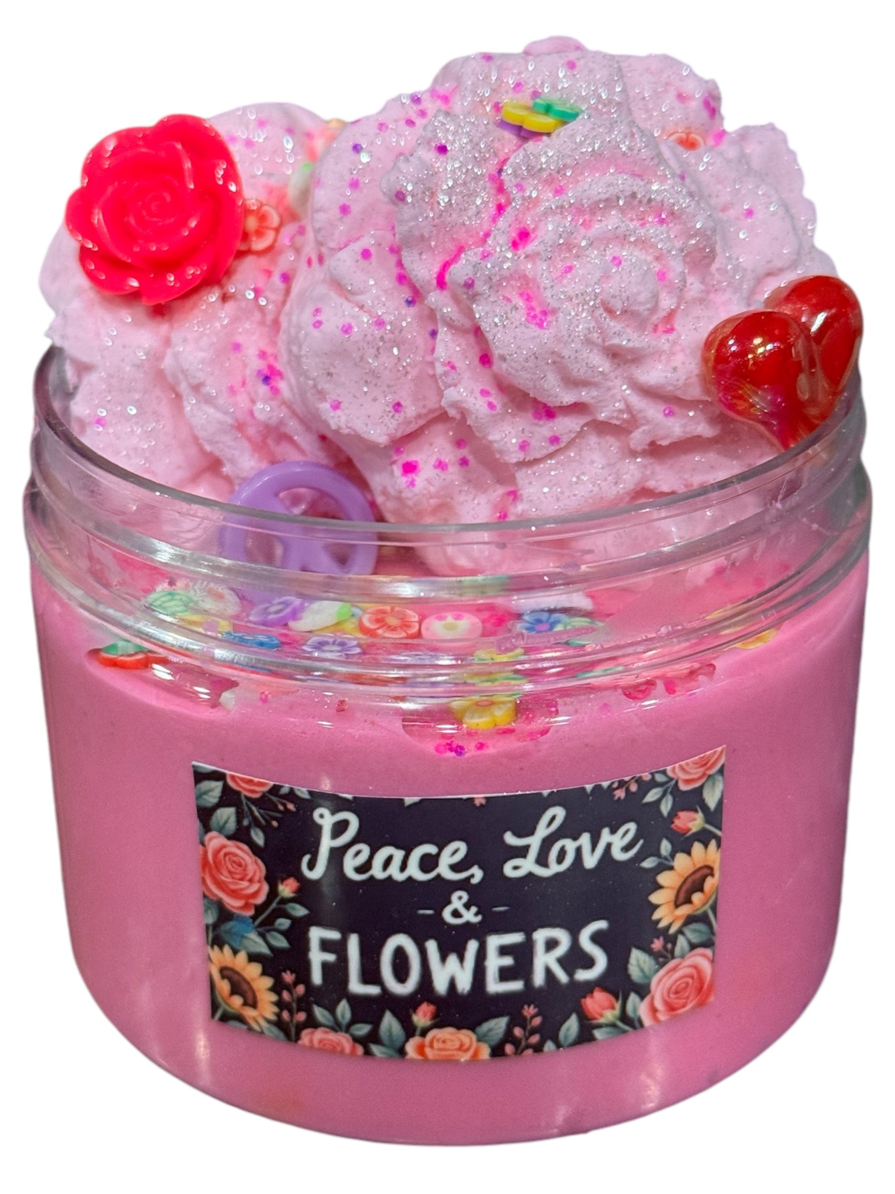 This slime is adorned with two beautiful clay flower add ins, as well as, a peace charm, a heart charm, a flower charm and floral sprinkles and pink glitter, adding an extra layer of delight to your sensory journey.